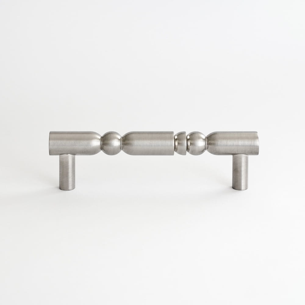 A unique nickel handle with a satin finish. This unique hardware has been designed with unusual interiors and unusual buildings in mind. It fits perfectly into the shapes of sophisticated furniture, but also turns simple chests of drawers into works of art.